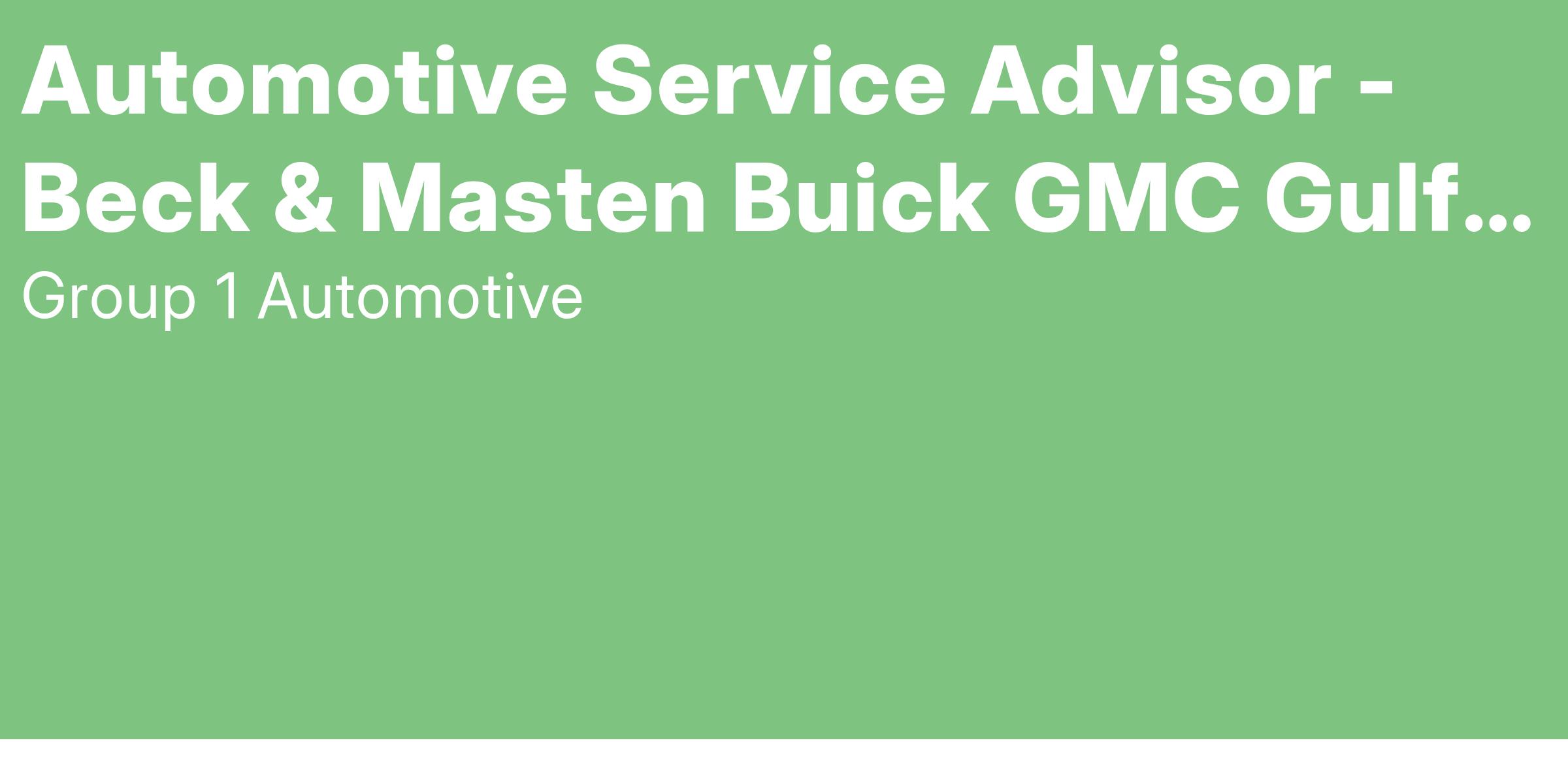 Beck & Masten South is part of the fast growing Group 1 Automotive, a leader in automotive retail sales and service in the Houston area. We are growing and looking to add Quality Experienced Automotive Service Advisors to work with our Quality Dealership representing the Quality of Buick and GMC! Our Service Advisor should be passionate about customer service and enjoy interacting with people throughout the working day.