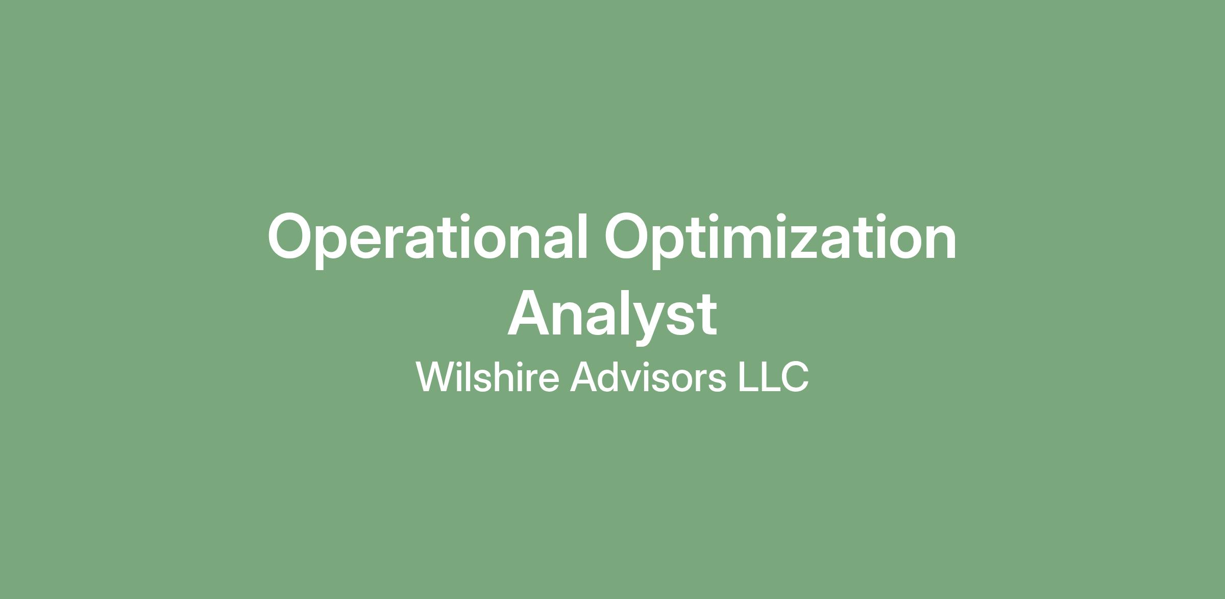 Wilshire is seeking an Operational Optimization Analyst to join our Data and Analytics team. This highly collaborative position provides significant exposure to multiple business functions, clients, and strategic initiatives. The Operational Optimization Analyst will support operations evaluations, data analysis, process improvement, and implementation of strategic projects focused on optimizing cost and operational structures for our fund and investment management clients, all while developing and maintaining strong client relationships.